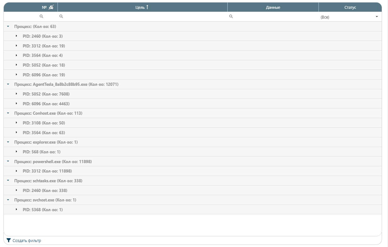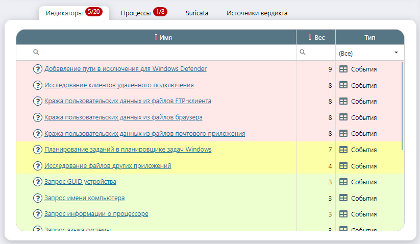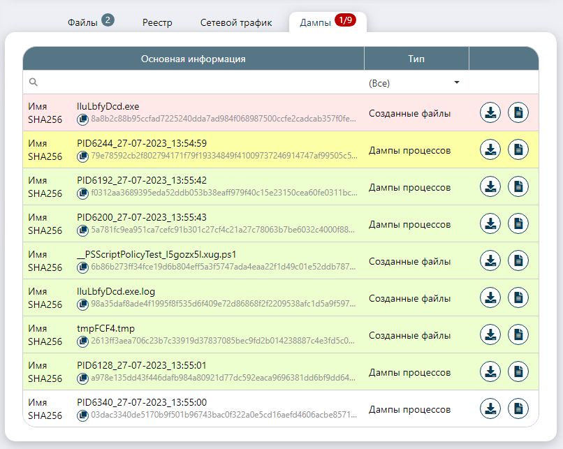 В блоке «Дампы» видно, что ПО во время работы создало свою копию, создало лог и оставила в системе временные файлы. В том числе, были собраны дампы процессов приложения, один из который в статическом исследовании был помечен, как «Подозрительный».