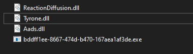 | ReactionDiffusion.dll | MD5 a87024a466e052bff09a170bb8c6f374f6c84c32 SHA-256 53f2ad060cf771aa4f197df5789cee95959480c244a0b392bb450c8ce7311d77 |