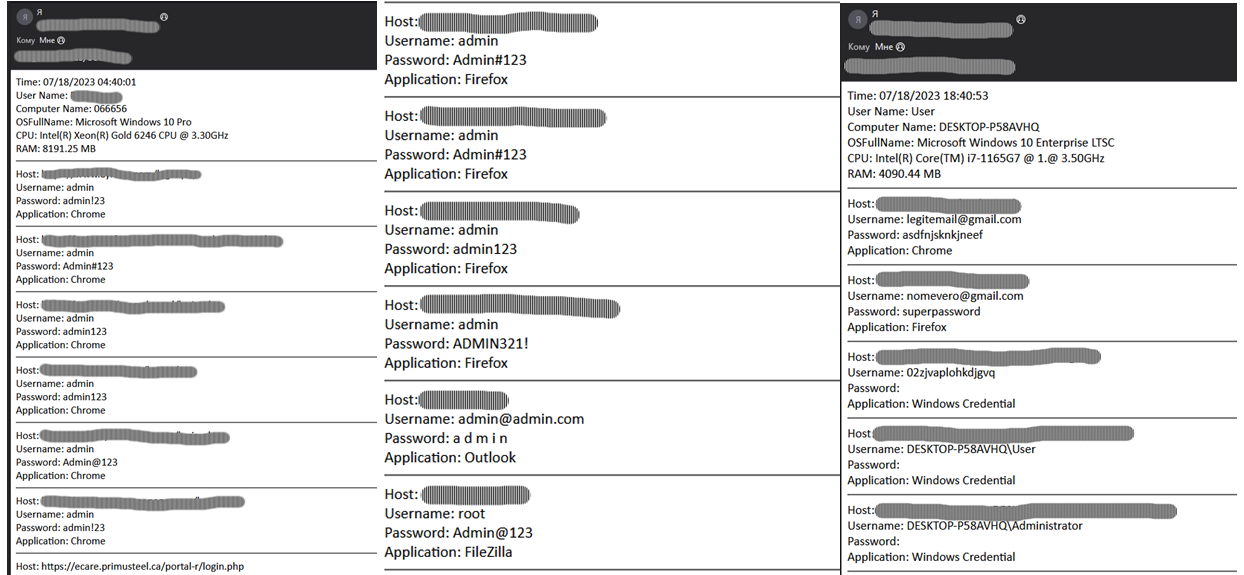 Так выглядят учётные данные на почтовом сервере злоумышленника, которые зловред отправляет ему, используя доступ к его почтовому ящику, из всех входящих сообщений 1/3 являются учетными данными присланные от вредоносного ПО для доступа к чужим учетным данным: