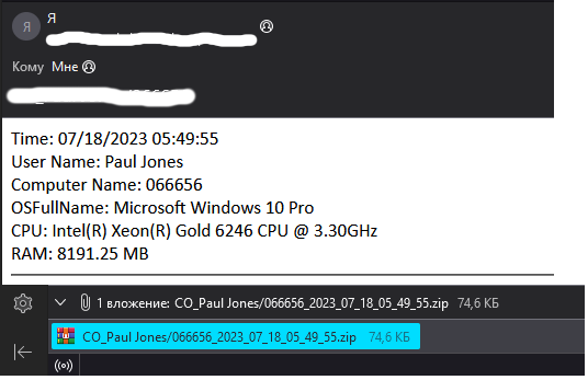 Если прогнать через www.unpac.me файл bddff1ee-8667-474d-b470-167aea1af3de.exe мы сможем увидеть учетную запись от SMTP-сервера злоумышленника: