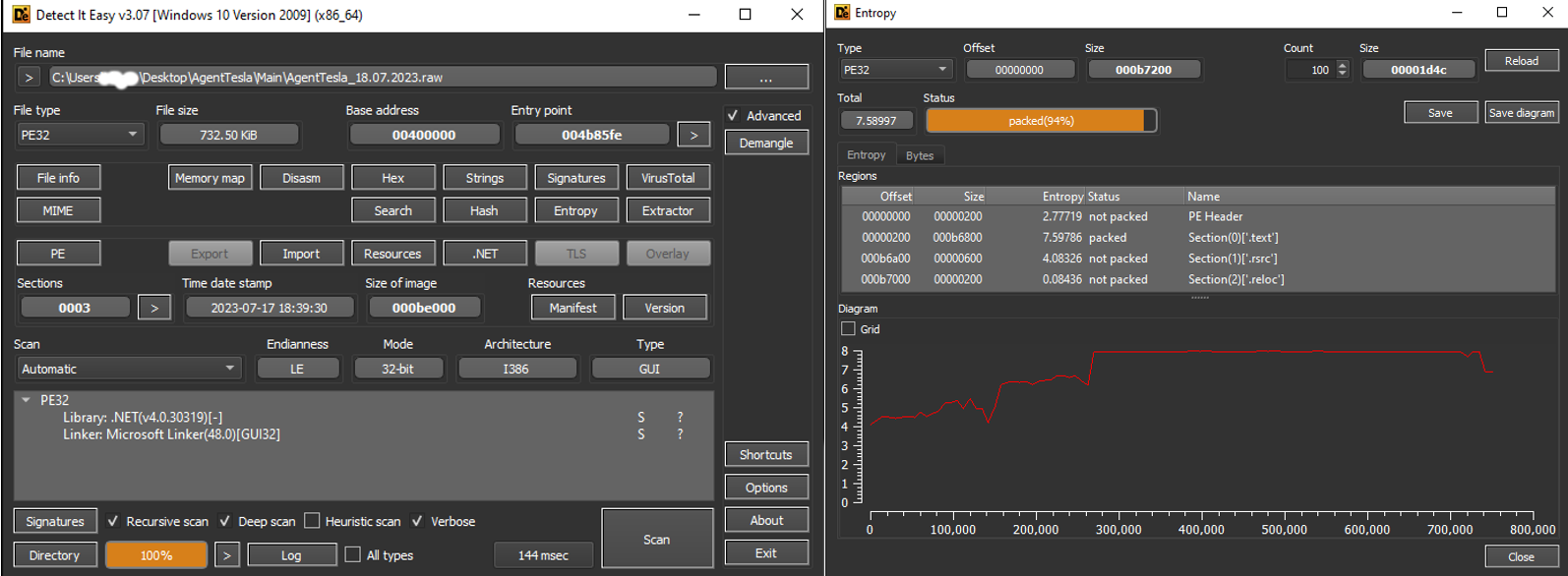 В метаданных, можно увидеть оригинальное название файла как EEna.exe. Detect It Easy показывает, что вредоносное ПО разработано, с использованием платформы .NET на языке C#, является 32-х разрядной, весит относительно немного и обфусцированна/упакована неизвестным протектором:
