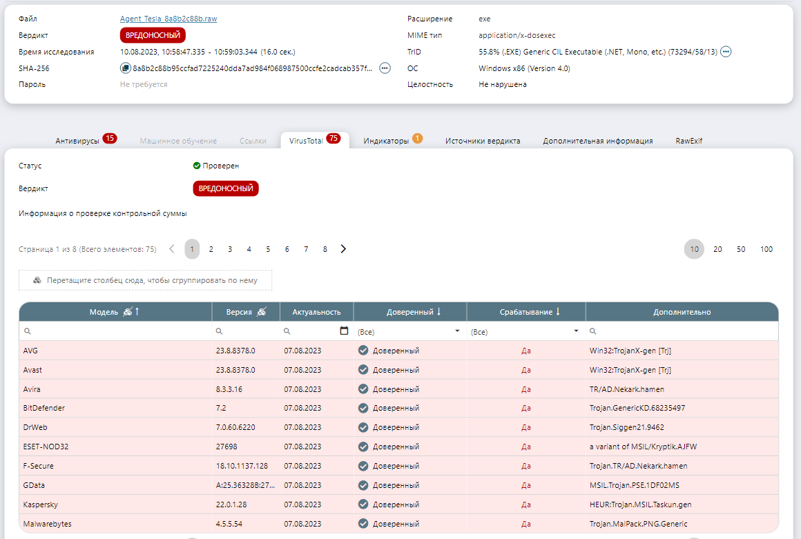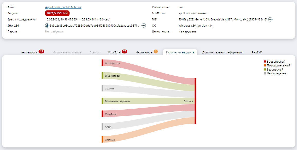 В статике, вредоносный вердикт, был вынесен за счет сигнатурного анализа с использованием антивирусов, внешнего аналитического ресурса VirusTotal, а также подозрительный вердикт вынесла «Система» из-за несоответствия вердиктов модели машинного обучения и антивирусных движков.