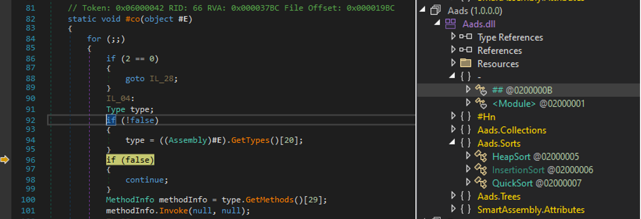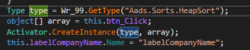 Опустившись чуть ниже, видно, что при помощи метода GetType инициализируется доступ к некоторому типу Aads.Sorts.HeapSort: