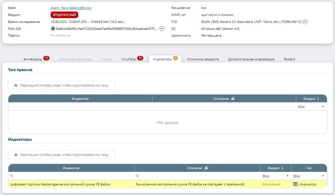 Во вкладке «Индикаторы» сработал индикатор «Цифровая подпись: Несовпадение контрольной суммы PE файла».