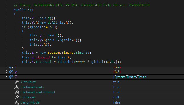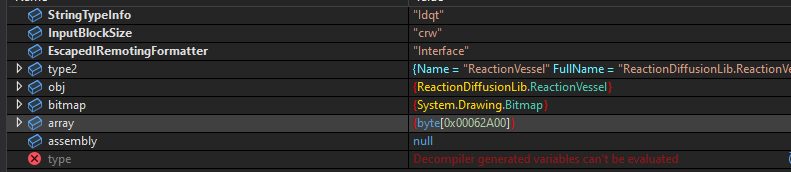 Перейдя на отладку Aads.dll можно заметить, что в самом начале выполняется метод Dodge в который как раз и передаются три аргумента, в нем же видно, как выполняется sleep на 34.6 секунд, после чего происходит распаковка и загрузка ReactionDiffusion и инициализация типа ReactionVessel, итоговым результатом данных действий, является распакованный динамический модуль Tyrone.dll, код которого сохраняется в динамическом 8-ми битном массиве array: