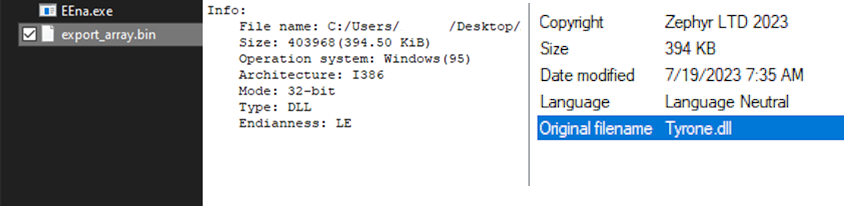 Извлеченные бинарные данные являются очередной динамической 32-х разрядной библиотекой, в метаданных видно, что авторские права пренадлежат некой компании Zephyr LTD, что скорее всего является дезинформацией, оригинальное имя библиотеки отображается как Tyrone.dll: