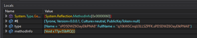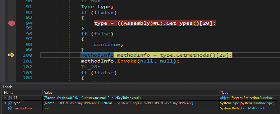 Инициализируется объект типа Assembly, с передачей параметров из-за обфускации кода, объект, принадлежит Tyrone.dll: