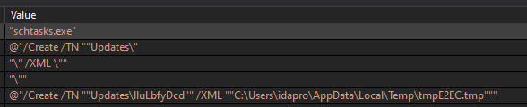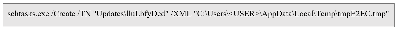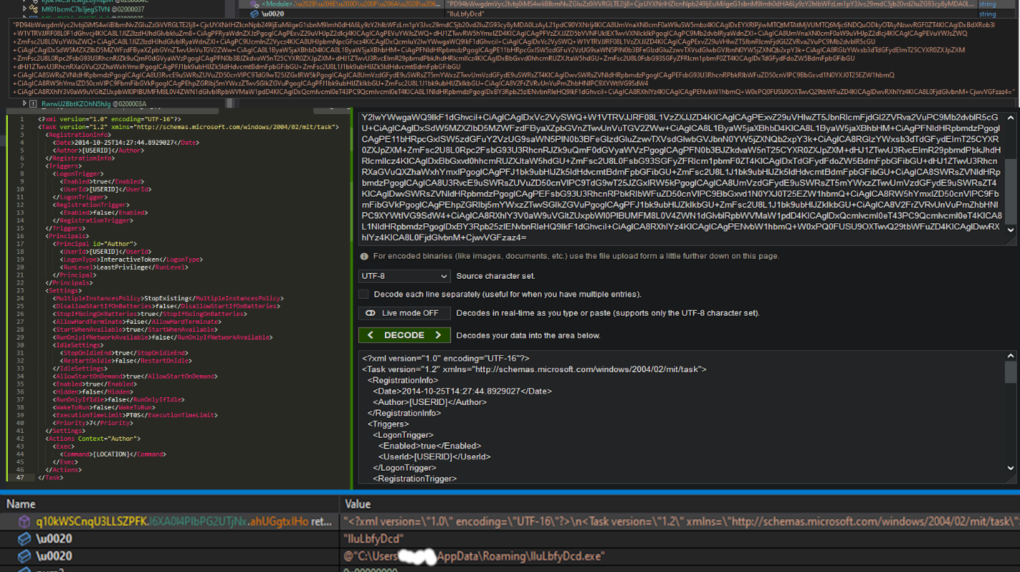 Далее инициализируется ряд параметров для создания задачи в планировщике задач, вредоносного процесса lluLbfyDcd.exe, путь до исполняемого PE прописывается в <Exec><Command>.