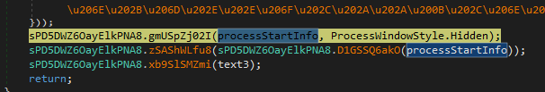 При помощи schtasks создается планирование новой задачи с передачей имени задачи и путь до xml-данных. После инициализации объекта с информацией для запуска задачи, происходит её запуск, с передачей аргумента Process.WindowStyle.Hidden указывая на то, что процесс нужно запустить со скрытым окном: