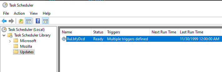 В планировщике задач, в Updates, видно новую задачу lluLbfyDcd готовую к запуску: