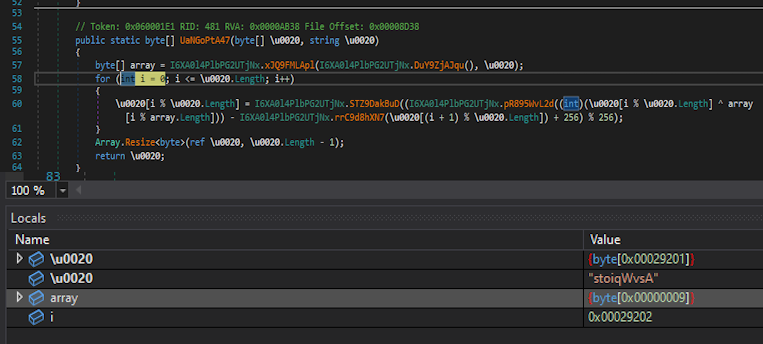 Данные массива деобфусцируются в бинарный PE-файл, с использованием ключа stoiqWvsa, который хранится в массиве array: