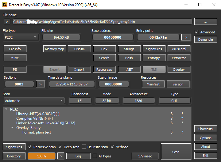 Дамп массива, открытый в Detect It Easy, показывает, что он является исполняемым PE созданным при помощи .NET и C#: