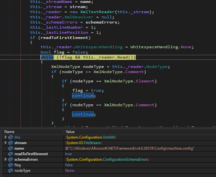 Далее вызывается метод GetRuntimeDirectory и возвращается директория в которой установлен CLR, после чего считываются данные из GetRuntimeDirectory() + Config\machine.config: