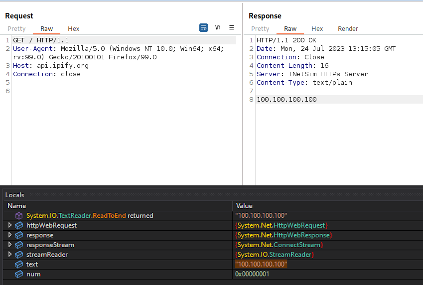 Чтобы в процессе отслеживать то, как будет вести себя зловред, самостоятельно был изменен возвращаемый ответ от inetsim, в итоге зловред получает подменный ip-адрес (100.100.100.100).