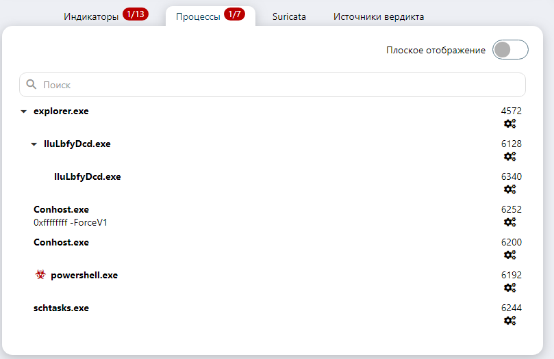 Среди системных программ, выявленных в процессе динамического исследования, были выявлены такие как: powershell.exe, conhost.exe, schtasks.exe: