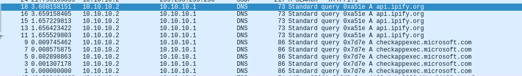 С помощью ПО Wireshark видно как осуществляются DNS запросы на api.ipify.org и checkappexec.microsoft.com: