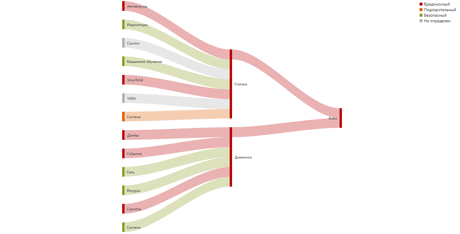Во вкладке «Источники вердикта» строится графическая карта с источниками и их вердиктами, а также общим вердиктом по исследуемому файлу.