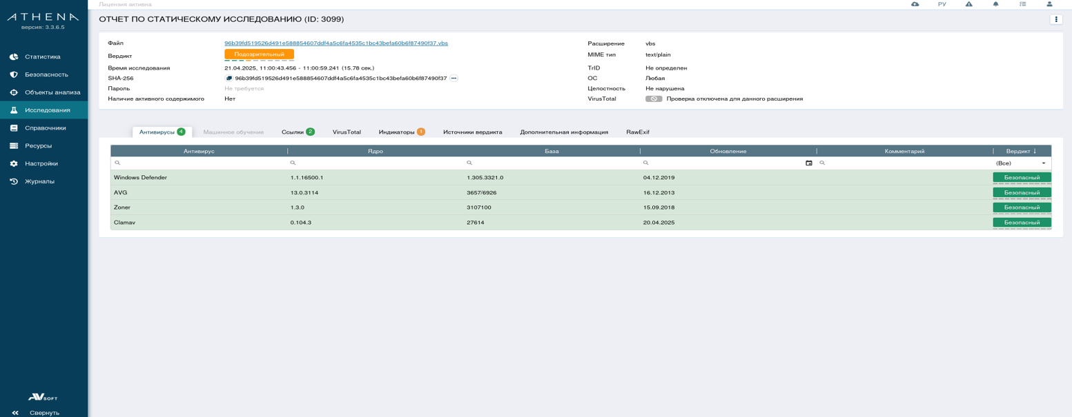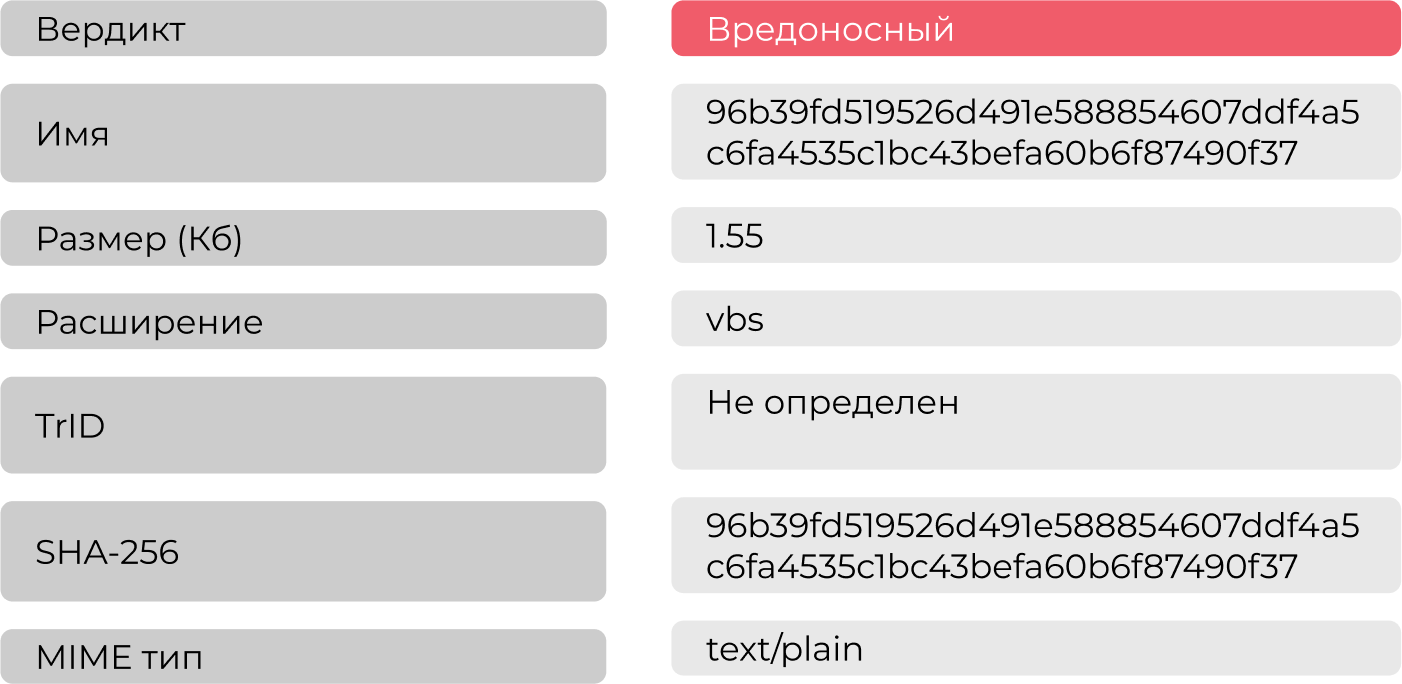 На анализ в систему Афина пришел офисный файл с расширением .vbs. Для начала была собрана его общая информация, представленная в таблице Таблица 1.