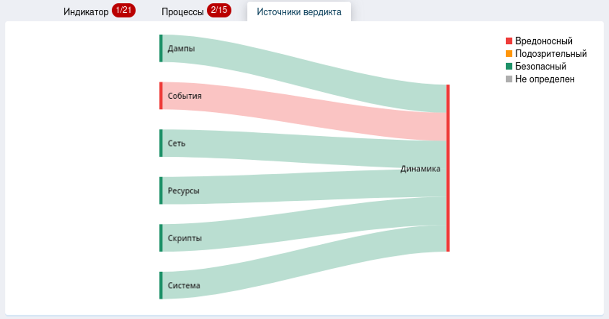 Во вкладке «Источники вердикта» можно ознакомиться с тем, какие источники посчитали файл вредоносным.