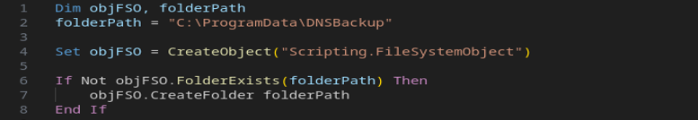 В части кода, указанной на скриншоте, видно, что скрипт создает объект для работы с файловой системой. Сначала проверяет наличие папки "C:\ProgramData\DNSBackup", и если ее нет, то создает. Это и будет рабочая папка для загрузки вредоносного файла.