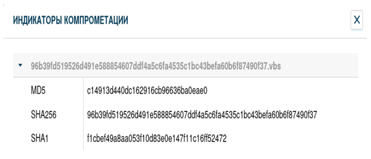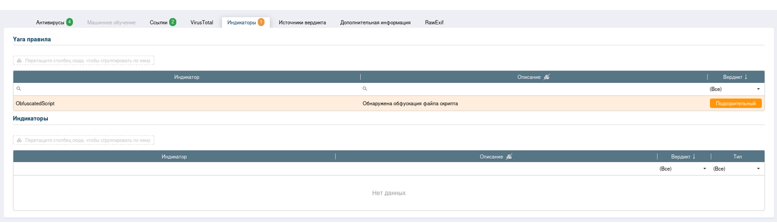Во вкладке “Индикаторы компрометации” отображаются индикаторы компрометации вредоносного поведения файла по результатам его проверки в «песочнице».