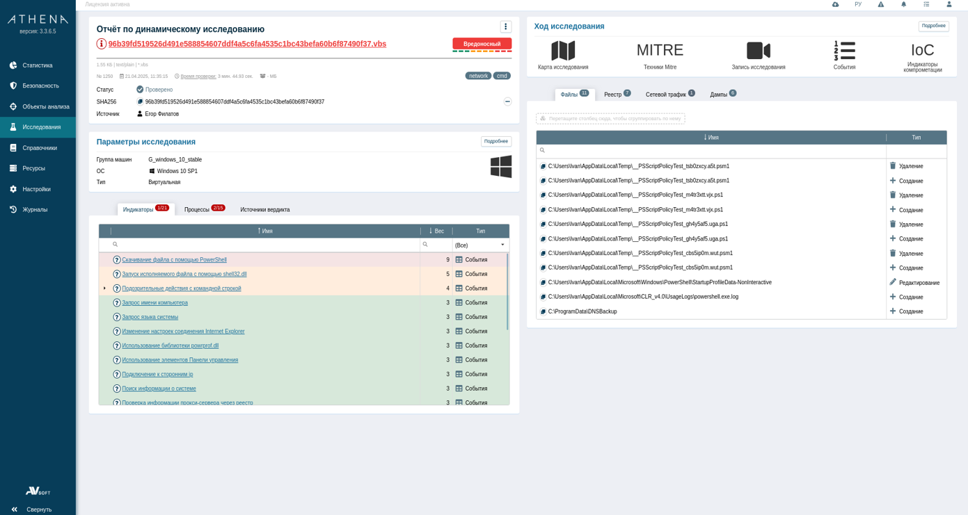Динамический анализ в системе AVSOFT ATHENA выявил несколько индикаторов: