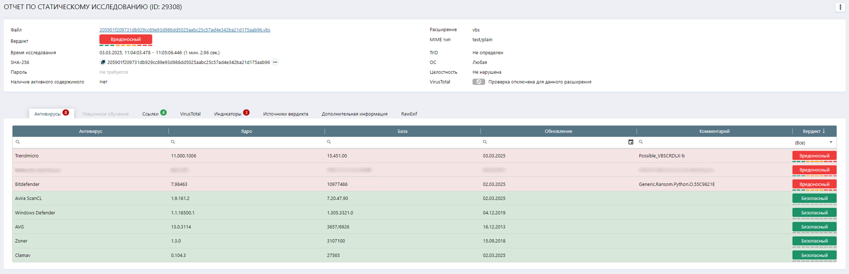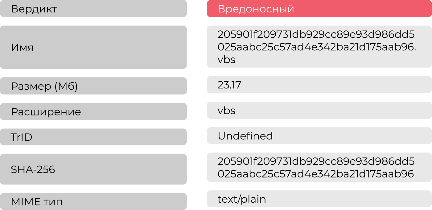На анализ в систему Афина пришел исполняемый файл с расширением vbs. Для начала была собрана его общая информация, представленная в таблице Таблица 1.