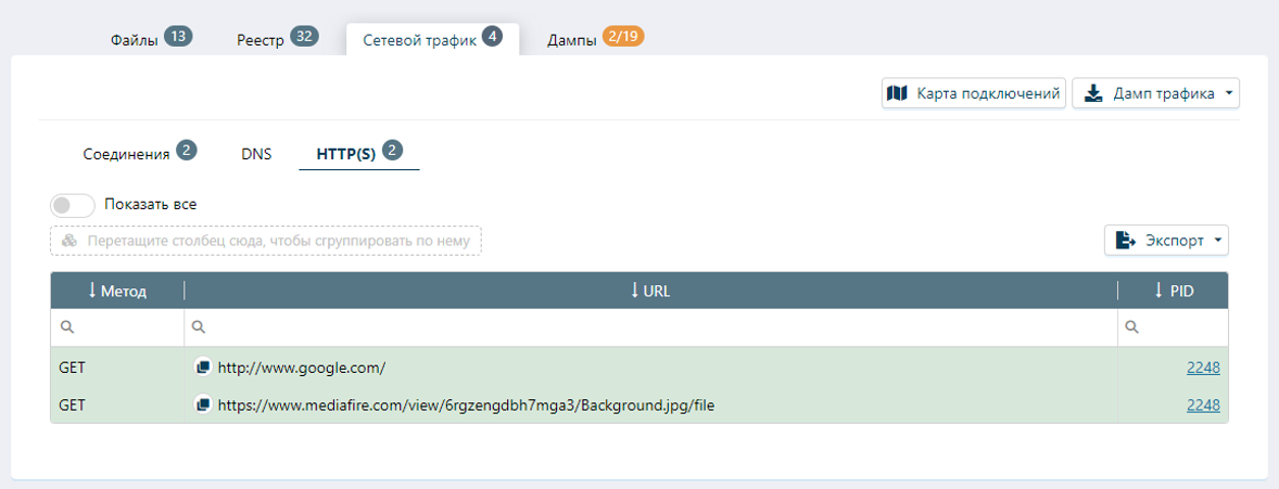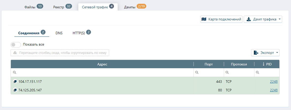 Во вкладке «Сетевой трафик» отображаются созданные сетевые соединения: