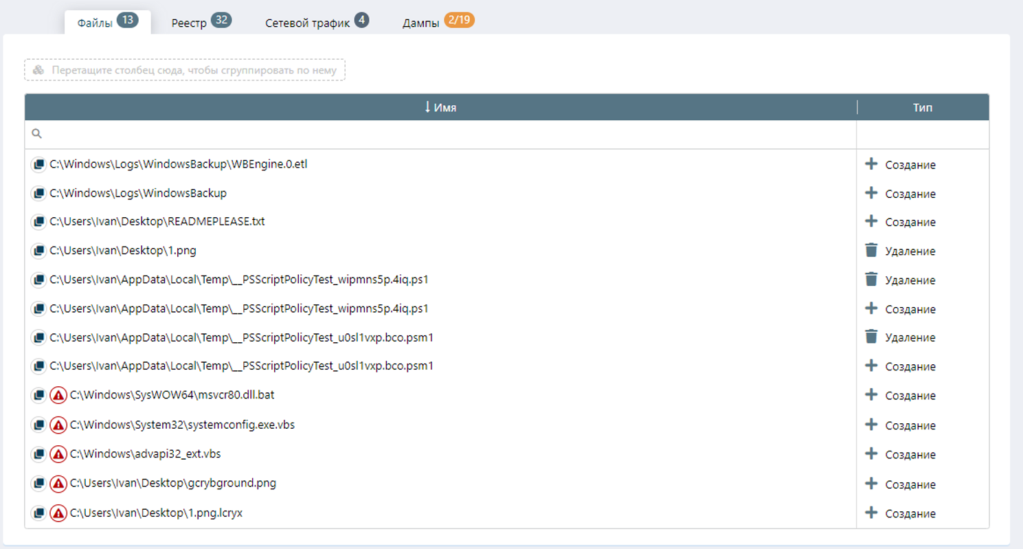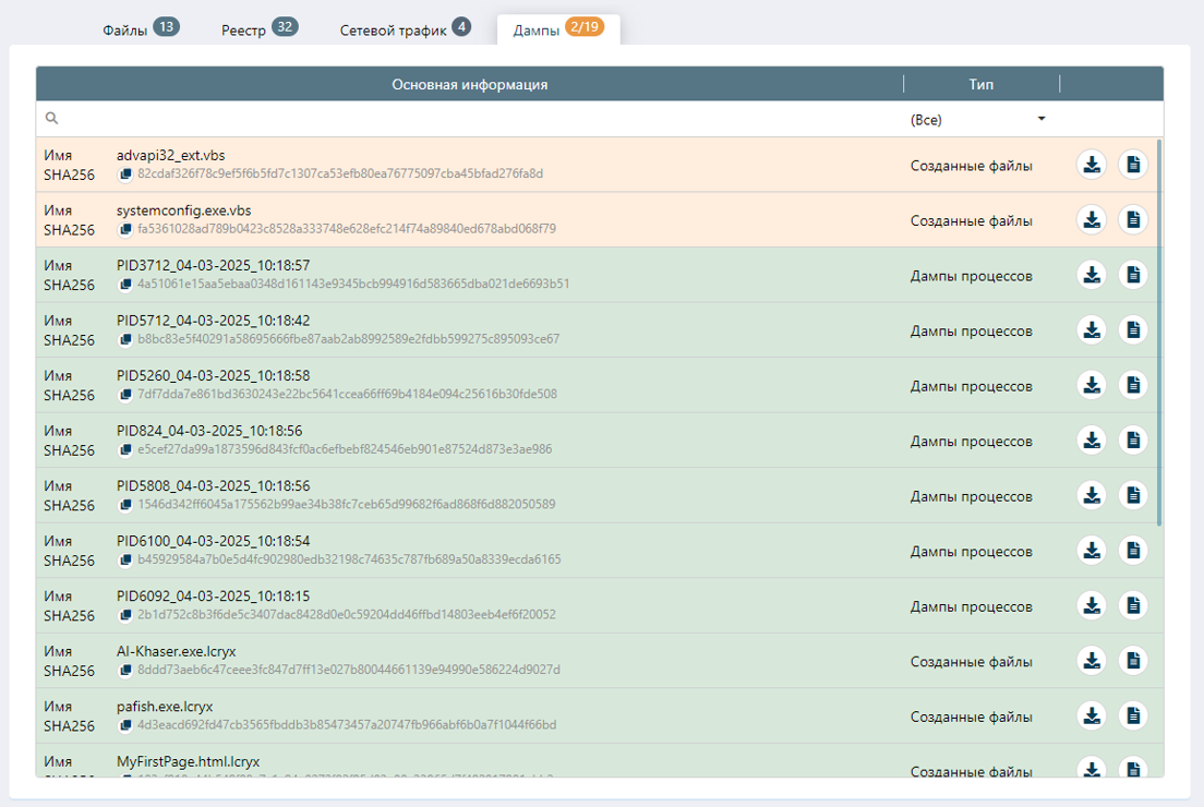 Во вкладке «Дампы» отображаются создаваемые файлы и дампы процессов, которые были получены в ходе исследования. Видим, что во время динамического исследования были созданы файлы advapi32_ext.vbs и systemconfig.exe.vbs имеющие подозрительный вердикт.