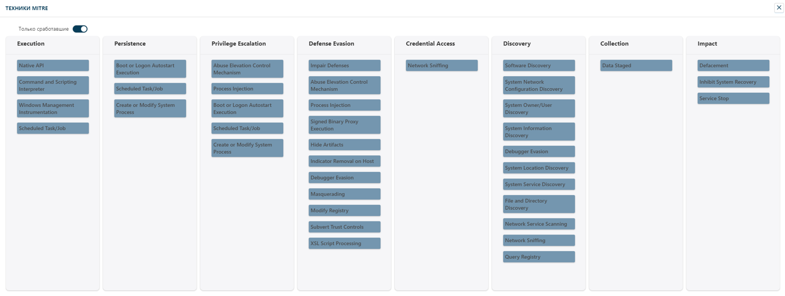 В окне «Техники MITRE» отображаются, какие тактики и техники задействованы для заражения устройства вредоносным ПО: