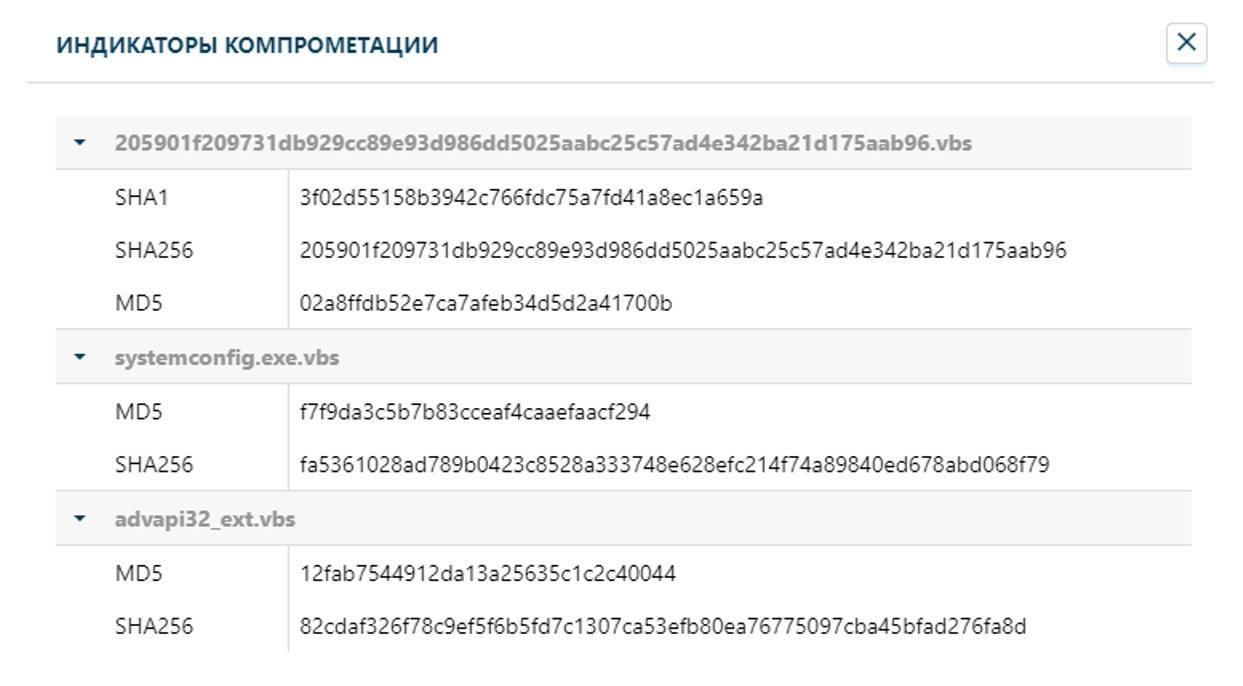 В окне «Индикаторы компрометации» контрольные суммы и IP-адреса с вредоносным содержимым: