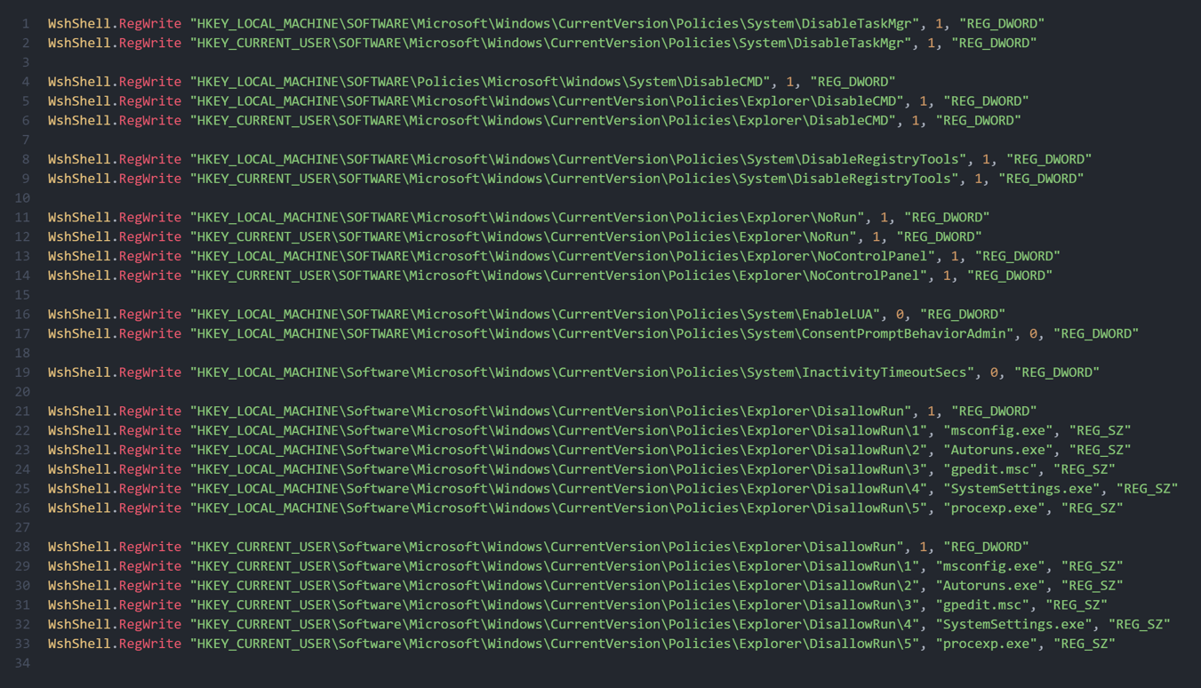 После получения прав скрипт изменяет записи в реестре, создавая в разделах политик ограничения на запуск системных процессов, в том числе: диспетчер задач, командную строку, редактор реестра, панель управления, контроль учетных записей (UAC), запрос на повышение прав для администраторов в режиме одобрения администратором (UAC), отключает тайм-аут блокировки экрана при бездействии. После чего создает директорию для политики DissallowRun, которая ограничивает запуск и выполнение указанных процессов: msconfig.exe, Autoruns.exe (Sysinternals), gpedit.msc, SystemSettings.exe, procexp.exe. Указанные действия представлены на скриншоте: