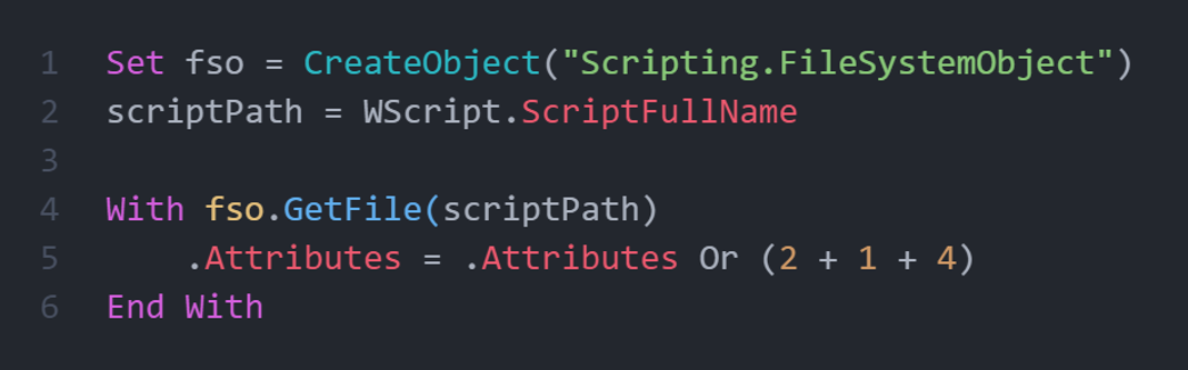 В том числе, исполняемый скрипт файла меняет собственные атрибуты на «Скрытый», «Системный» и «Только для чтения»: