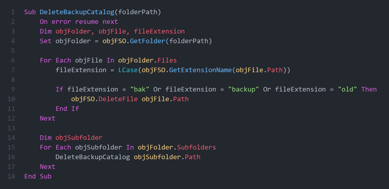 Для удаления резервных копий определяется функция, которая получает путь, в котором происходит рекурсивный обход всех директорий, после чего все файлы с расширениями «.bak», «.backup» и «.old» будут удалены.
