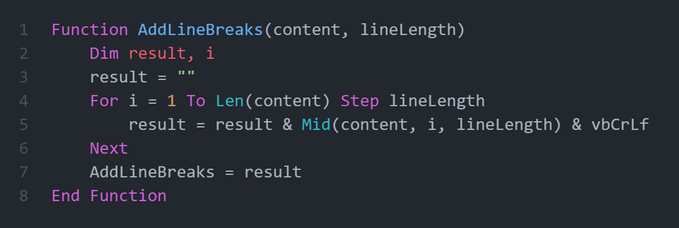 Далее, создается определение функции для добавления разрывов в строке, формируя подстроки заданного размера: