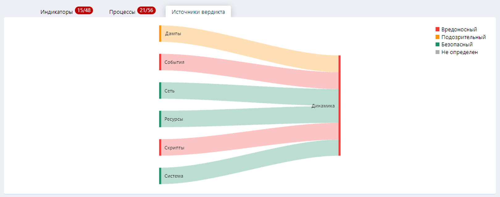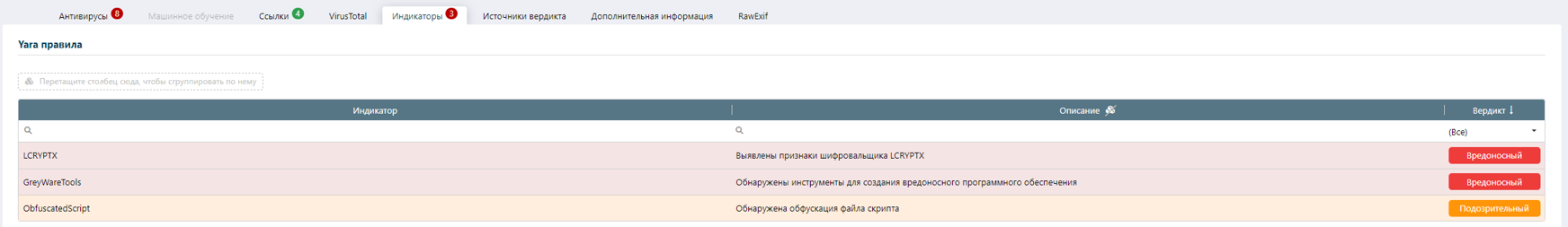 Во вкладке «Источники вердикта» можно ознакомиться с тем, какие источники посчитали файл вредоносным.