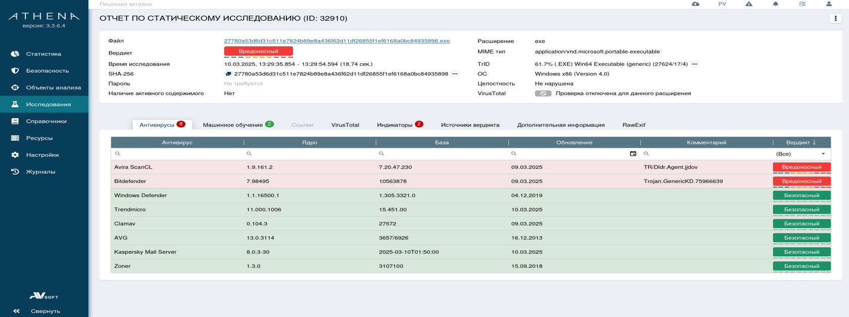 Исследования файла происходило с помощью системы ATHENA. Посмотрим на статический и динамический анализ файл в системе ATHENA.