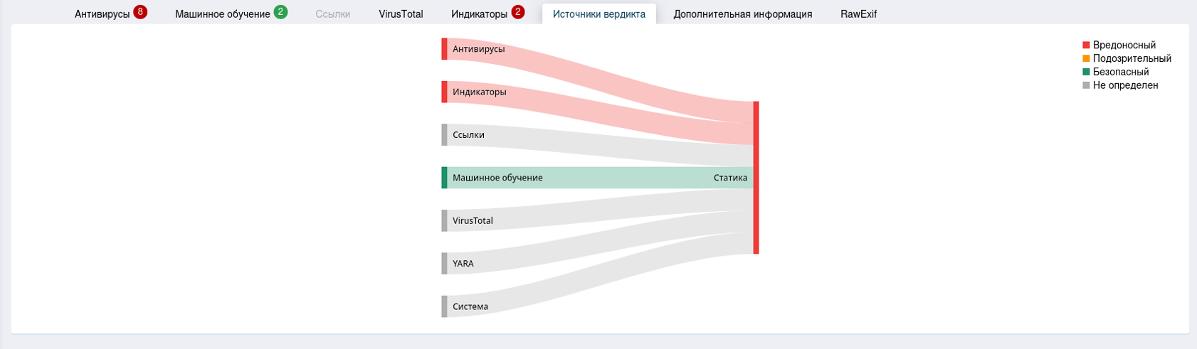 Во вкладке «Источники вердикта» можно ознакомиться с тем, какие источники посчитали файл вредоносным.