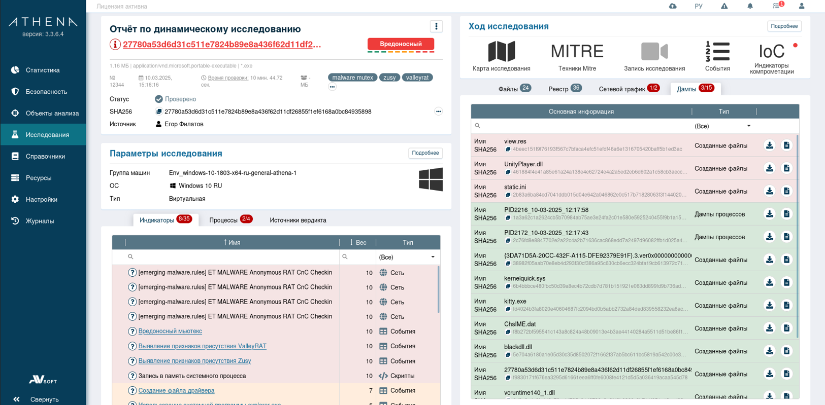 Динамический анализ в системе AVSOFT ATHENA выявил несколько индикаторов: