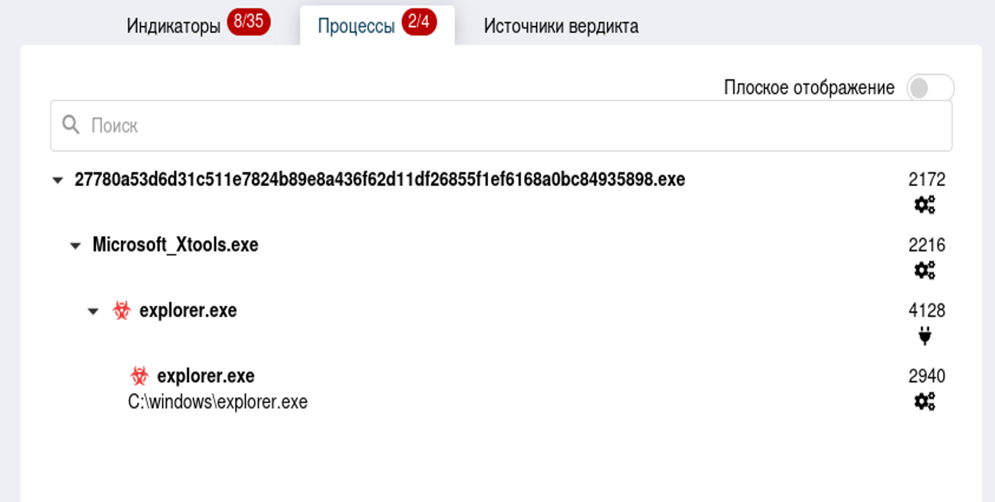 Во вкладке “Индикаторы компрометации” отображаются индикаторы компрометации вредоносного поведения файла по результатам его проверки в «песочнице».