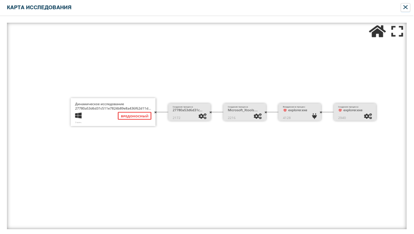 3) Использование системной программы explorer.exe - программа explorer отвечает за графический интерфейс ОС Windows пользователя. При запуске она вызывает дочерние процессы, не контролируемые защитой Windows. ПО использует explorer для выполнения стороннего файла, что является подозрительным действием.